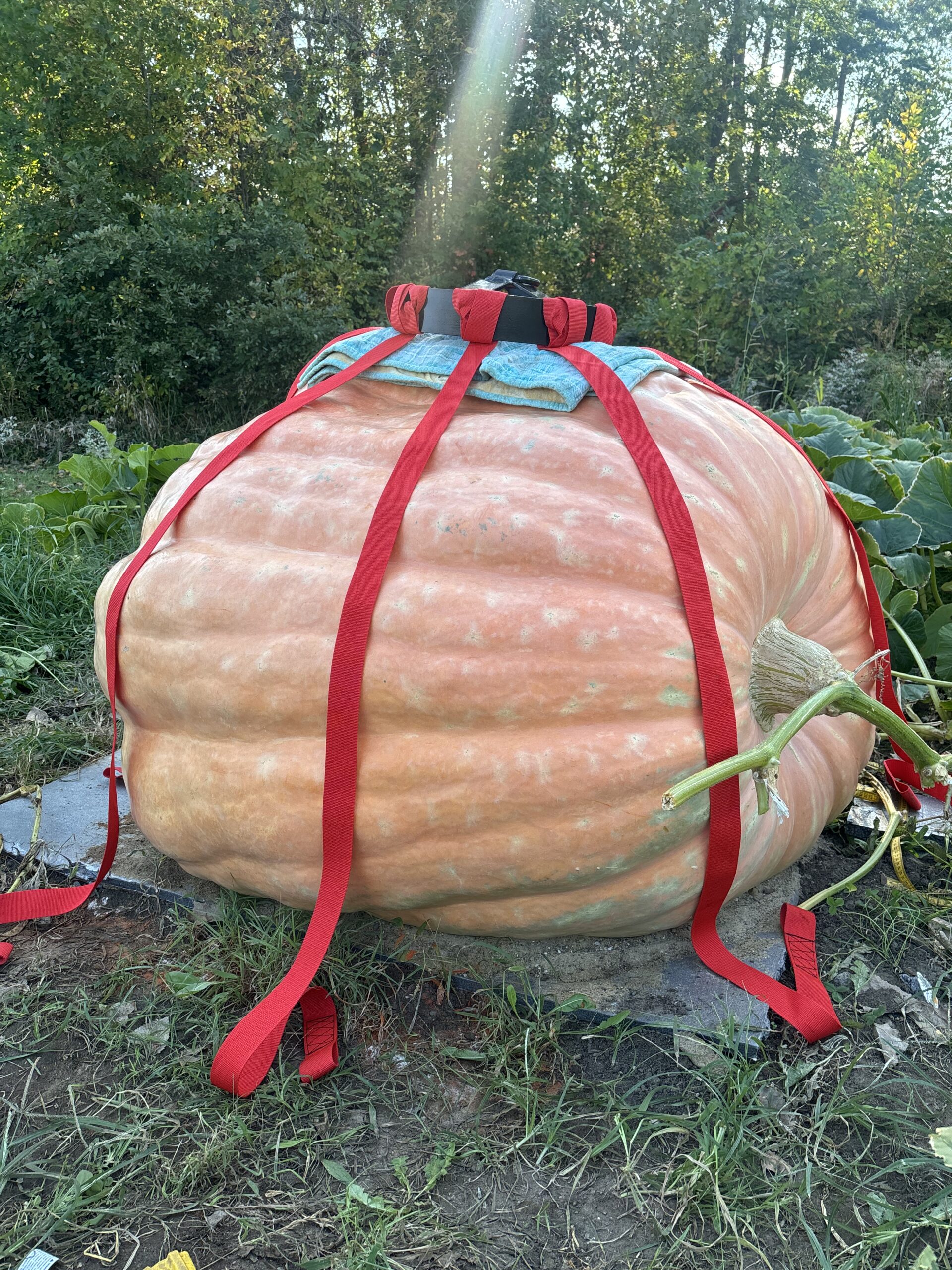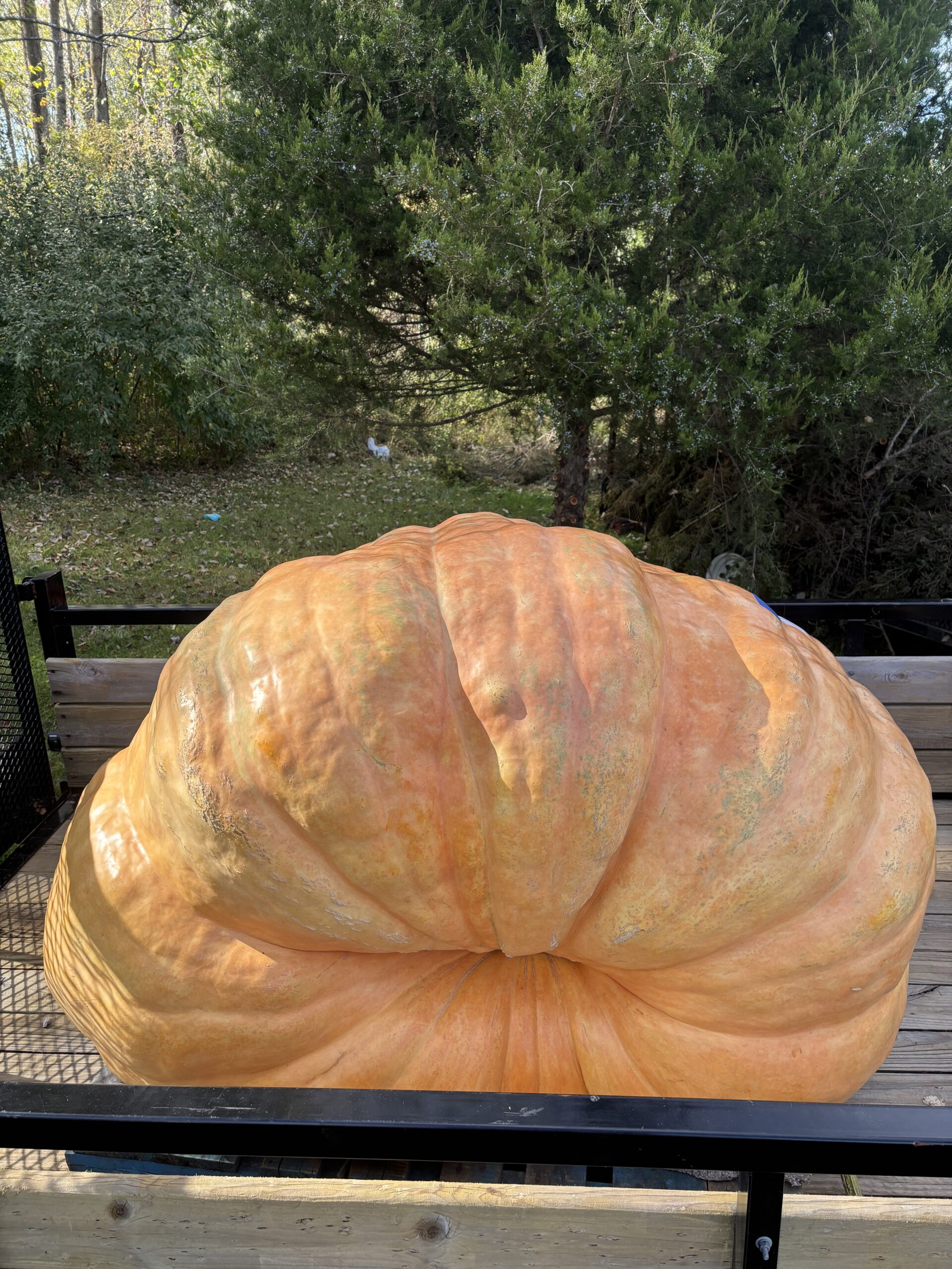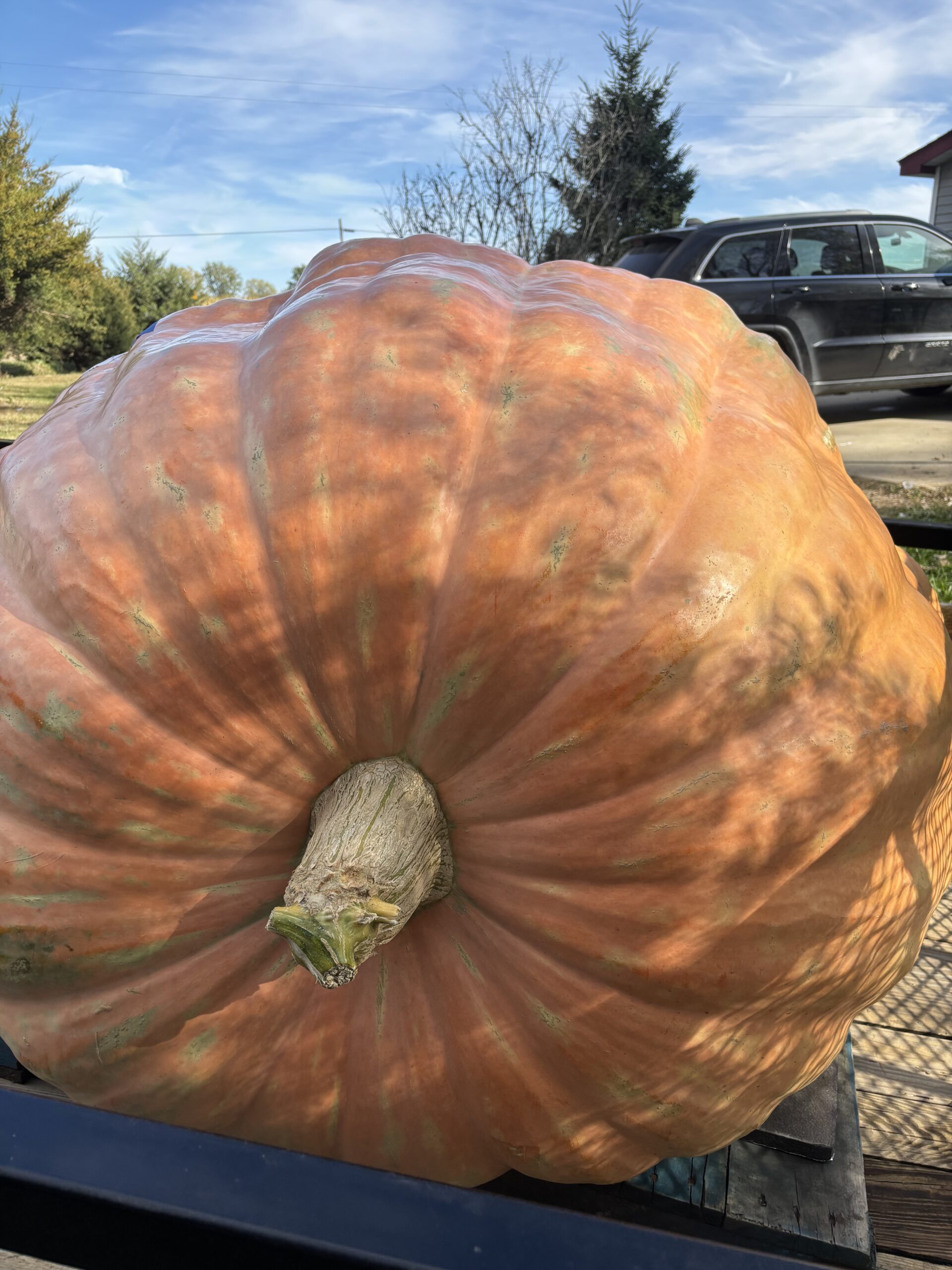 This is a pretty orange pumpkin grown from the 2670 Thompson x self polinated. so it will keep this look. This is a rare find as most of them were white, ugly blobs. The 2670 Thompson 2024 season was the fourth largest Pumpkin all-time grown in the world so you’re looking at some great champion genetics here.